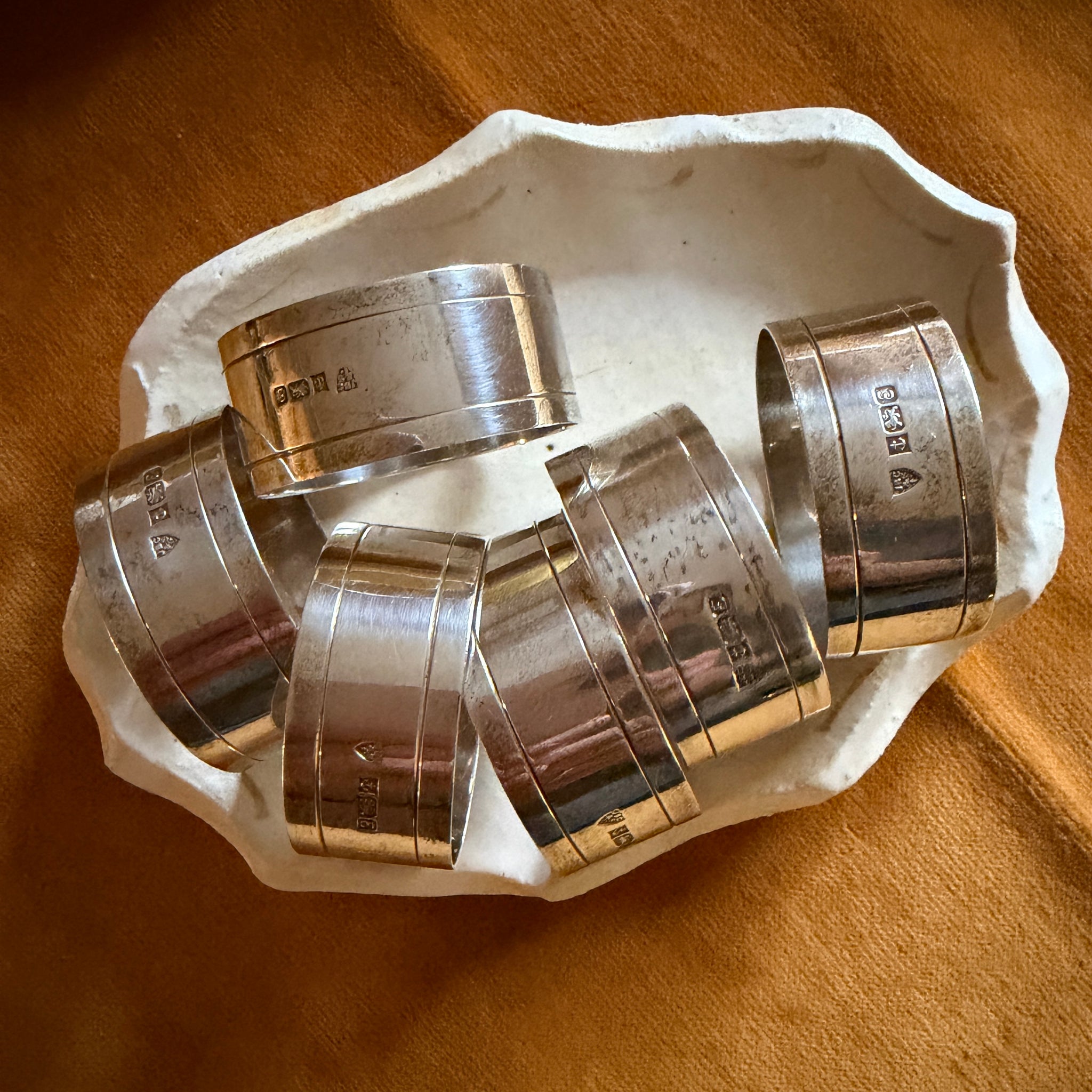 Set of six matching English Sterling Silver napkin rings from my own collections. Hall marked and Dated c.2000's.